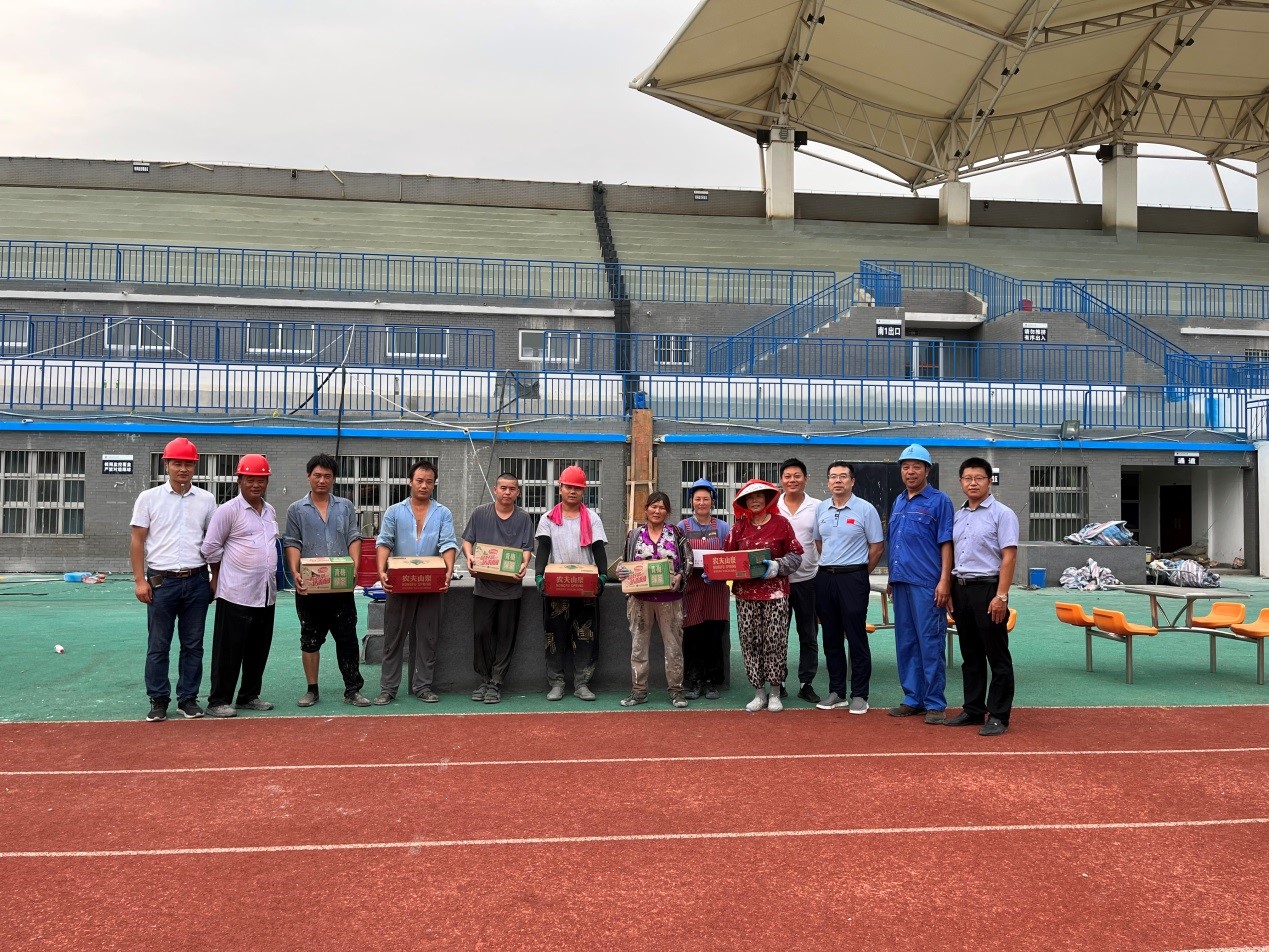 初心不惧高温,主题党日活动送“关心”。8月15日,烈日当空,热浪滚滚,在主运动场看台项目施工现场,机关第十六党支部、体育学院党总支的党员先锋队们向高温下的户外工人师傅们传递了关心,并带着自费购买的西瓜、矿泉水、金银花露和防暑药物,给挥汗如雨、坚守岗位的劳动者们送上清凉和关心,提醒他们工作要避开中午高温时段,并邀请工人师傅们到体育学院一楼大厅喝喝茶、歇歇脚,叮嘱大家把生命安全和身体健康放在第一位,时刻绷紧疫情防控和安全生产这根弦。