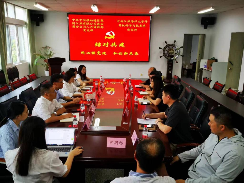 为进一步发挥基层党支部优势,推动党建与业务的深度融合,9月9日下午,在计算机楼306会议室,计算机科学与技术系教工党支部与中国移动通信集团江苏有限公司连云港分公司人力资源部党支部(以下简称“人力资源部党支部”)开展“同心强党建 和创共未来”结对共建交流活动。学院党委班子成员、计算机科学与技术系教工党支部全体党员参加了此次活动。