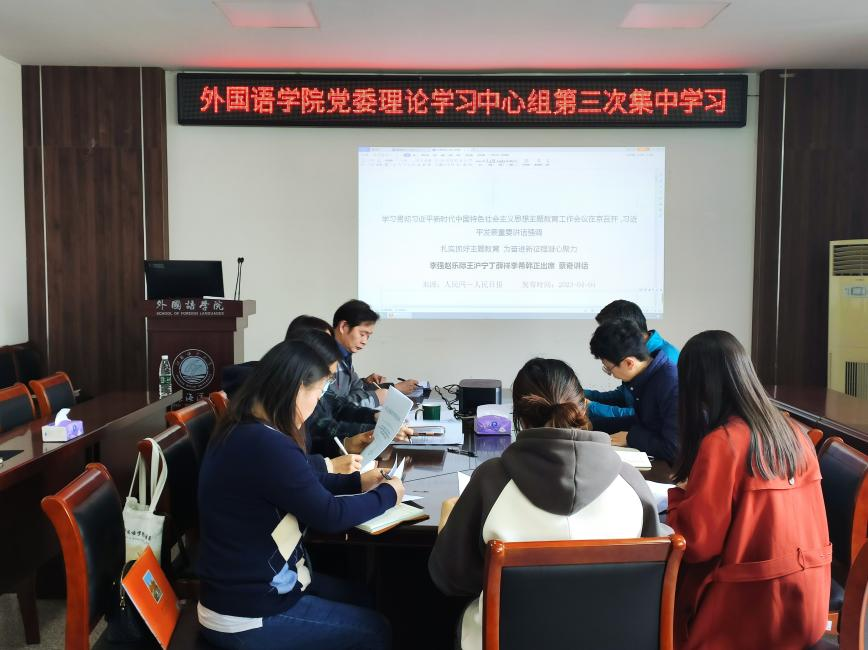 为推动学习贯彻习近平新时代中国特色社会主义思想主题教育深入开展,4月24日下午,外国语学院举行党委理论学习中心组第三次集中学习暨主题教育动员大会,会议由党委书记田德勇主持,学院全体班子成员和各党支部书记参加会议。