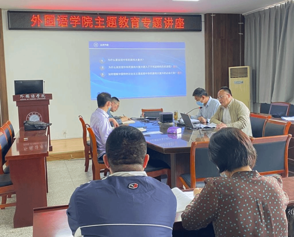 为学习贯彻习近平新时代中国特色社会主义思想主题教育,进一步引导广大教职工读原著、学原文、悟原理,5月31日下午,外国语学院组织全体教职工进行主题教育专题学习,此次学习邀请马克思主义学院陈忠锋老师作专题讲座,学院党委书记田德勇主持会议。