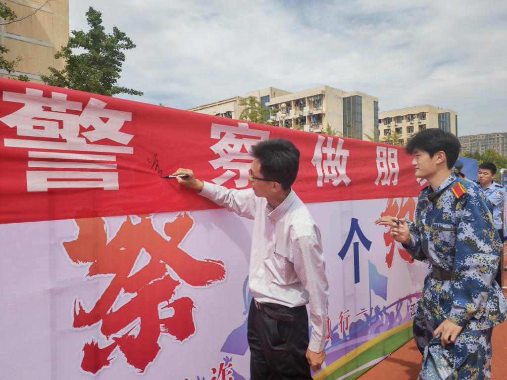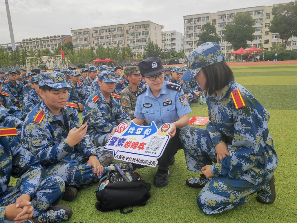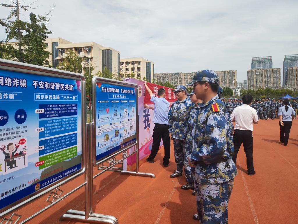 9月16日上午,机关党委第十四党支部(保卫处)联合连云港市高新公安分局郁洲派出所党支部在苍梧校区西田径场,组织开展“我和警察有个约定”主题党日活动。苍梧校区2023级参训新生参加活动。