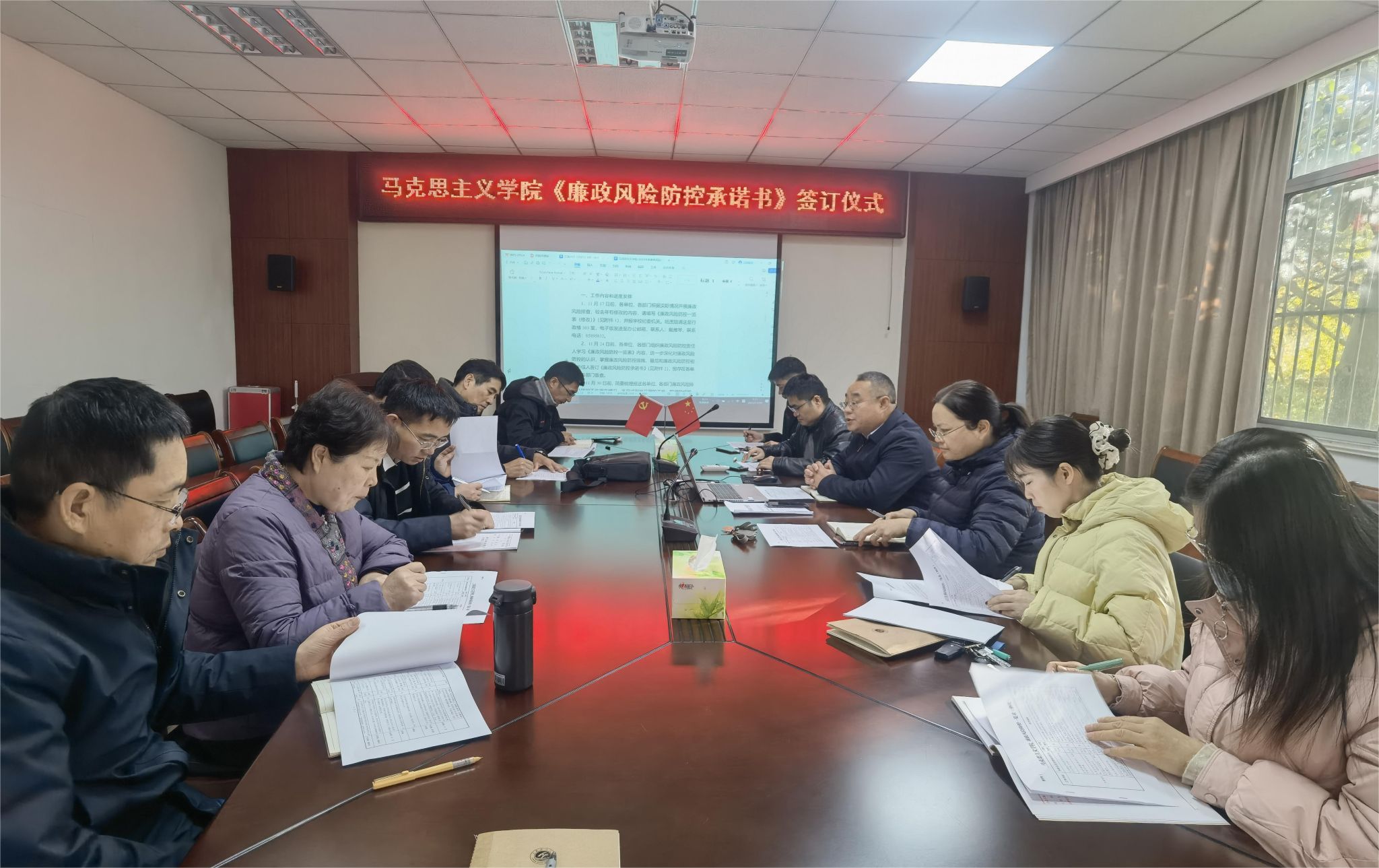 参观学习结束后,马克思主义学院组织参加活动人员学习了学院《廉政风险防控一览表》内容,重点掌握廉政风险点及主要表现形式、具体防范措施,最后签订了《廉政风险防控承诺书》。