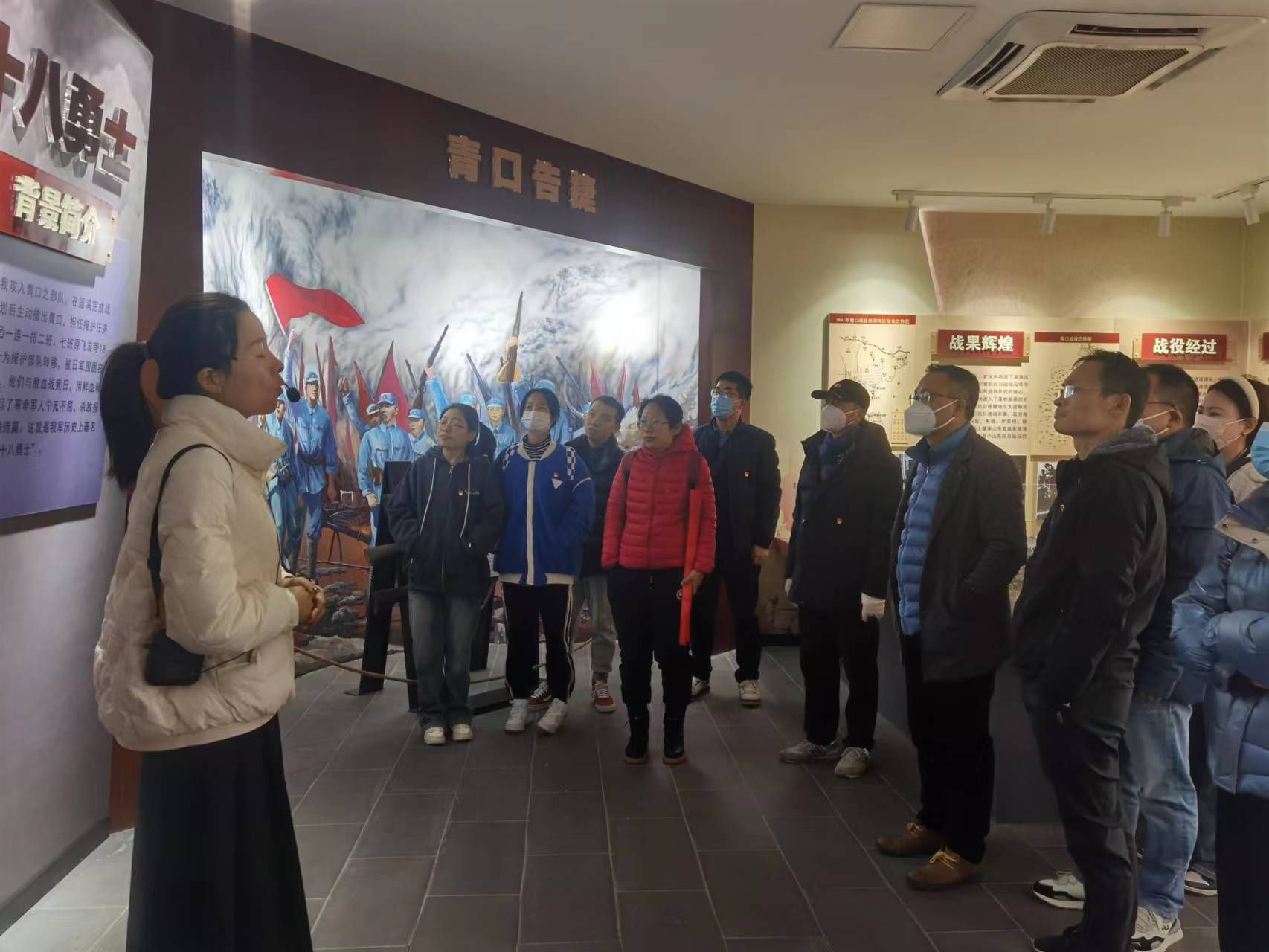 在青口十八勇士纪念馆,讲解员讲述着18位英雄的故事,“大家认真聆听红色故事,共同缅怀革命先烈,追忆“青口十八勇士”面对强敌不屈不挠、壮烈牺牲的英雄事迹。