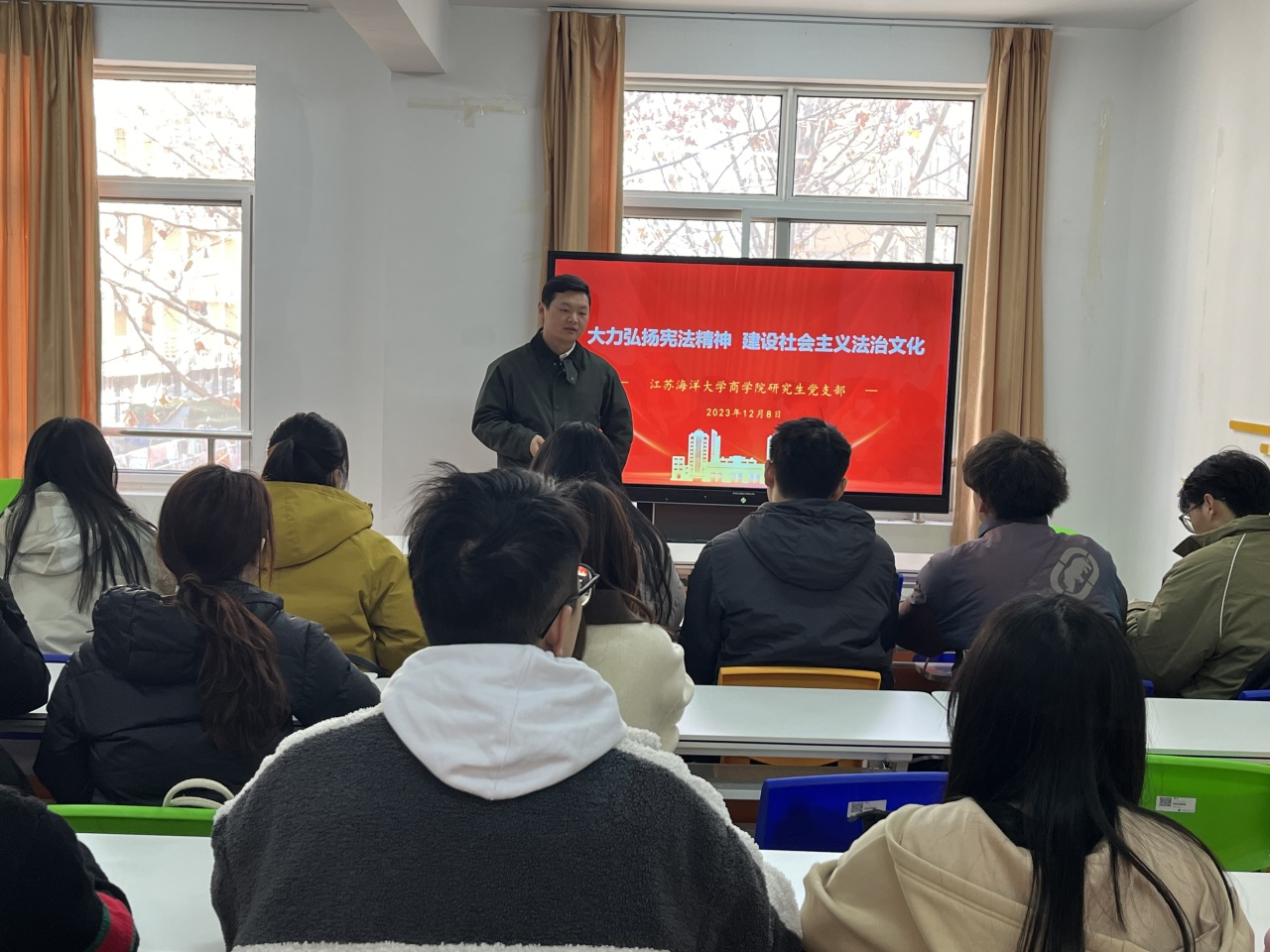 学生第二党支部“研习社”开展宪法学习专题师生座谈会,辅导员邱天琦和学生入党积极分子一起研究习近平法治思想,探讨学生干部在法治校园建设中的角色作用;商学院研究生党支部以“支部书记讲党课”的形式,对十年来法治中国建设的卓越成就和推进全面依法治国的重要意义有了更深入的认识。