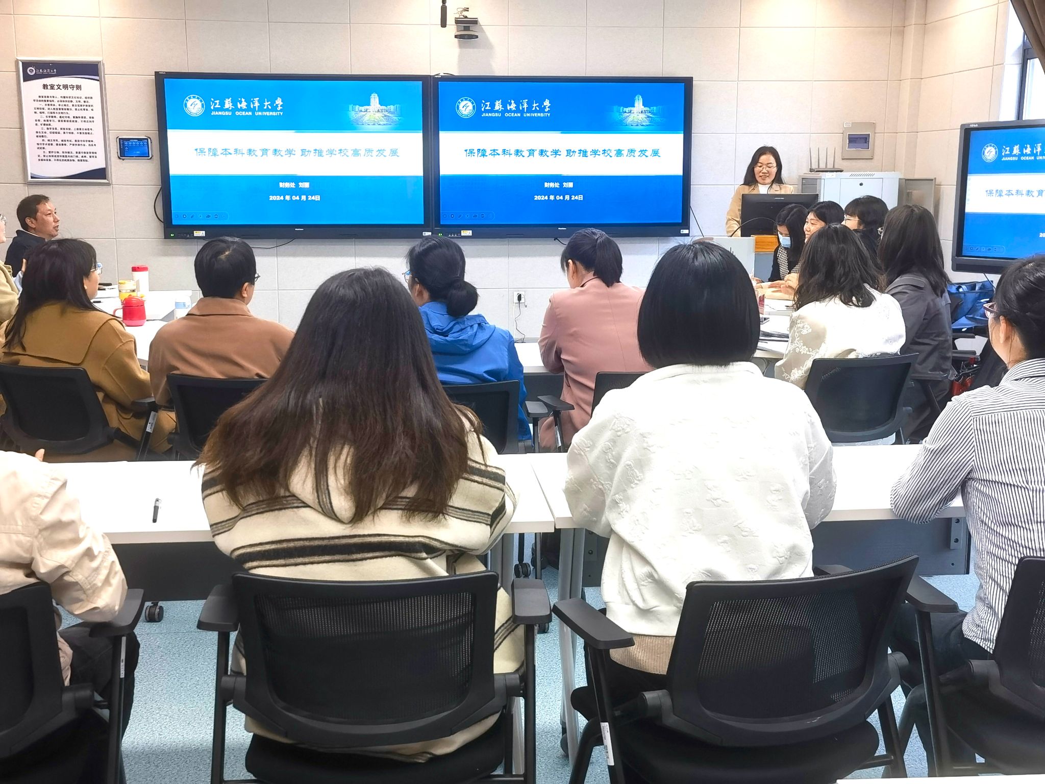 刘丽以《保障本科教育教学 助推学校高质发展》为题讲授专题党课。党课内容紧扣审核评估要求及财务处在人才培养中的地位和作用,全面介绍了财务处在支持和优先保障本科教育教学方面所采取的政策措施、工作亮点及经费投入情况。总结了财务处以党建引领为抓手、以服务师生为核心,严密部署,积极落实学校迎评任务的工作成效,指出了财务工作中存在的不足之处,提出了下一步工作计划。她强调,“以评促建、以评促改,是对全校的一次体检,也是对财务工作的一次体检”,财务处要认真落实校第一次党代会任务和精神,聚力“三建一高”,以审核评估为契机,推动财务工作高质发展,进一步赋能本科教育教学高质量发展,奋力谱写国内知名、特色显著的高水平应用研究型海洋大学新篇章。