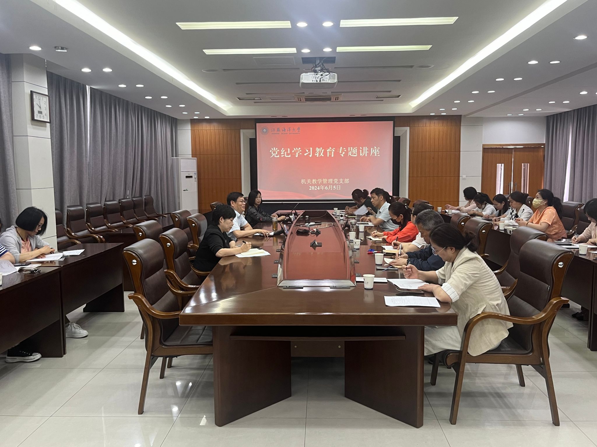 为进一步强化党纪学习教育成效,引导机关工作作风转变,6月5日上午,机关教学管理党支部邀请机关党委书记汪守建作党纪学习教育暨机关工作作风建设专题讲座。支部全体干部职工参加活动,活动由支部书记安俊丽主持。