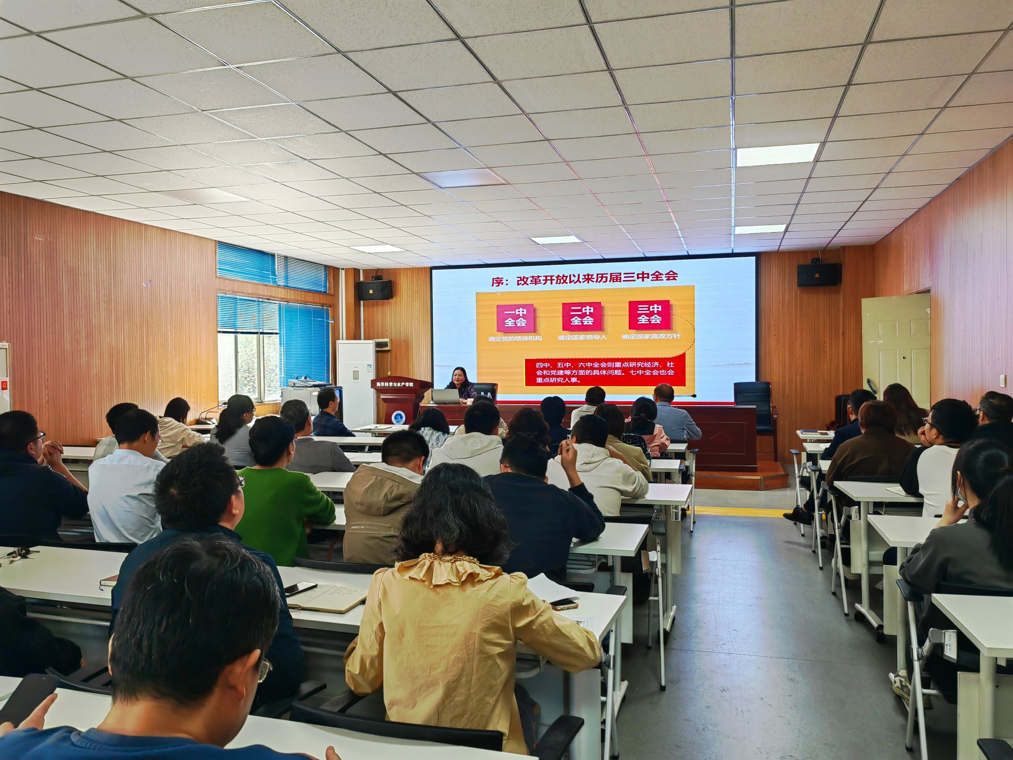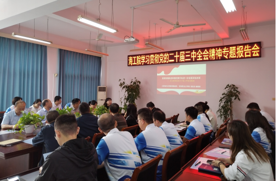 10月16日下午,海洋工程学院举行学习贯彻党的二十届三中全会精神宣讲报告会,邀请校宣讲团成员、马克思主义学院副教授倪念念博士做题为《紧紧围绕推进中国式现代化进一步全面深化改革》的专题报告。学院党总支书记唐正康主持,全体教职工参加报告会。