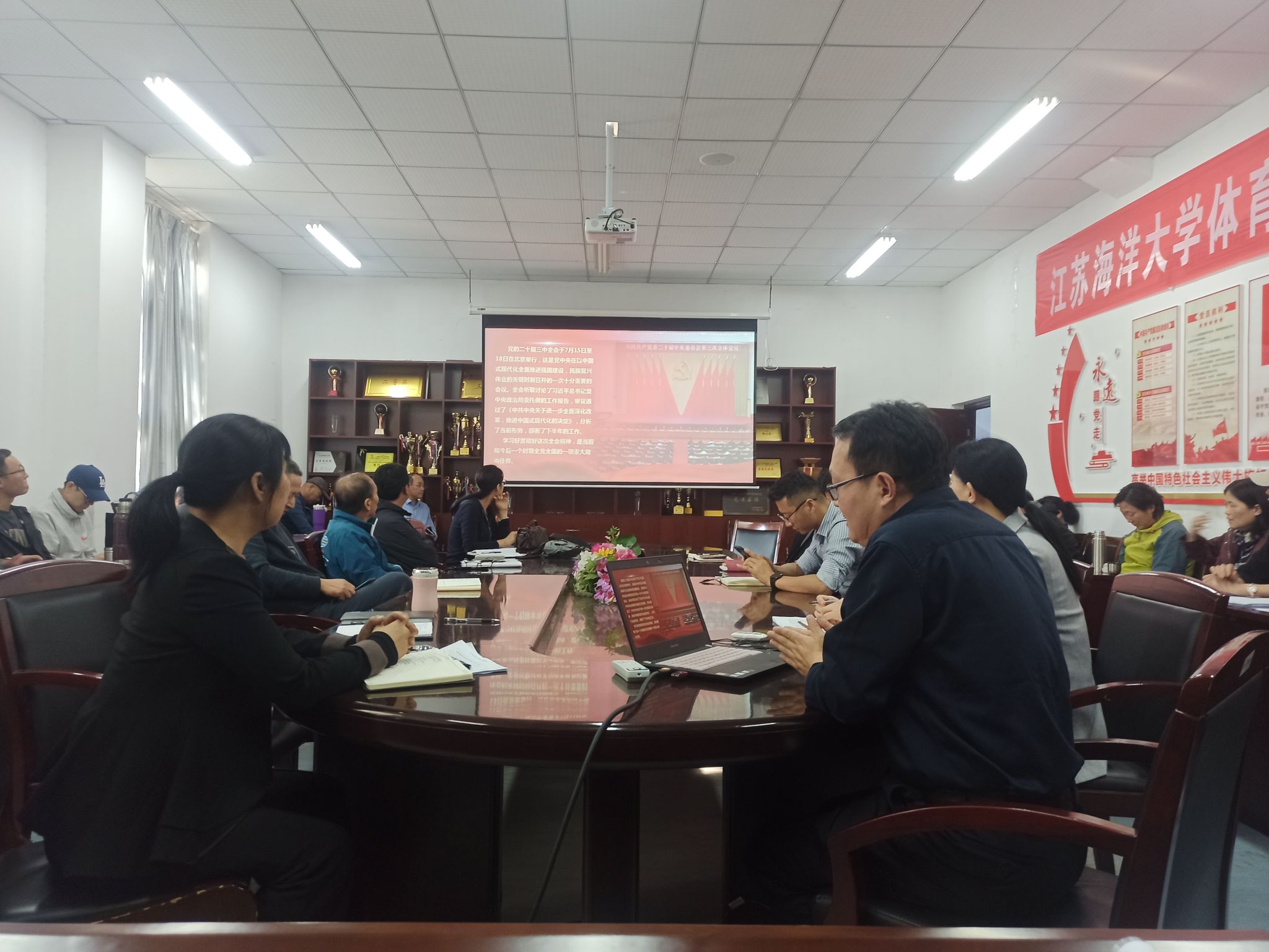 为深入学习领会党的二十届三中全会精神,10月9日下午,体育学院党总支邀请江苏海洋大学党的二十届三中全会精神宣讲团成员、文法学院党委书记魏范青作党的二十届三中全会精神宣讲报告,报告会由学院党总支书记张萍主持。
