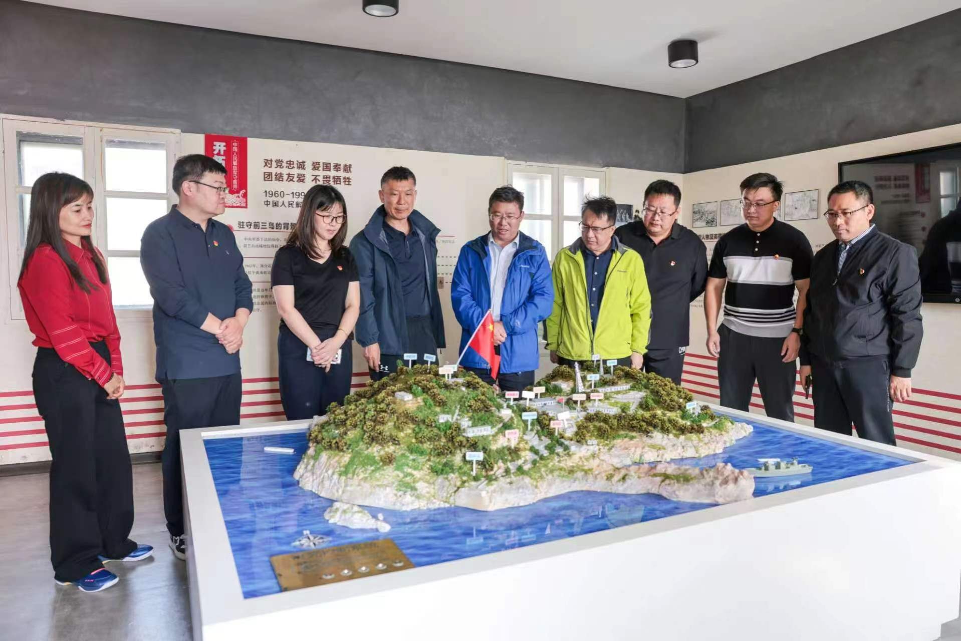 前三岛陆域面积约为0.32平方公里,由平山岛、达山岛、车牛山岛等岛礁组成。位于黄海前沿,地势险要,自古以来便是祖国的战略要地和海防前哨。在达山岛,全体党员实地参观了防空洞、领海基点、民兵哨所和东大坡炮轨等场所。通过“重走巡岛路”,党员们切身体会到驻守海防边境、守岛为国的责任与担当。岛史馆内通过沙盘、图片和实物展示,使大家对达山岛的重要战略位置以及边防民警、乡政府民兵等戍边卫国、守岛建岛的事迹有了更深入的了解。