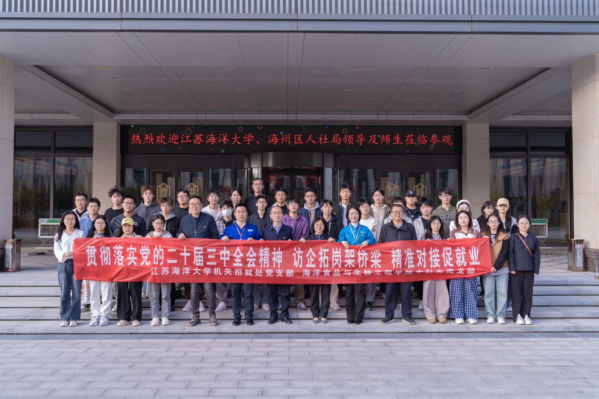 为深入贯彻落实党的二十届三中全会精神,以务实举措扎实推进学生高质量就业,10月25日下午,机关招就处党支部、海洋食品与生物工程学院本科生党支部组织35名学生代表赴日出东方、鹰游纺机、小瓜科技等3家海州区代表性企业参访交流,联合开展“贯彻落实党的二十届三中全会精神,访企拓岗架桥梁,精准对接促就业”主题党日活动。海州区人社局党组书记、局长董志红、机关招就处党支部书记马恒通、海洋食品与生物工程学院党委副书记郭利、招生与就业处副处长骆海宏以及支部党员参加本次活动。通过这次行动,进一步深化了校政企合作,有效汇聚了社会各方资源,拓展了优质就业实习实践基地,促进了人才供需的精准对接。