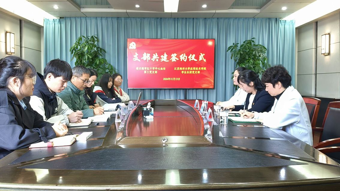 连云港市中心血站第三党支部书记赵小娟与应用技术学院学生社团党支部书记陈姝含签订支部结对共建合作协议。