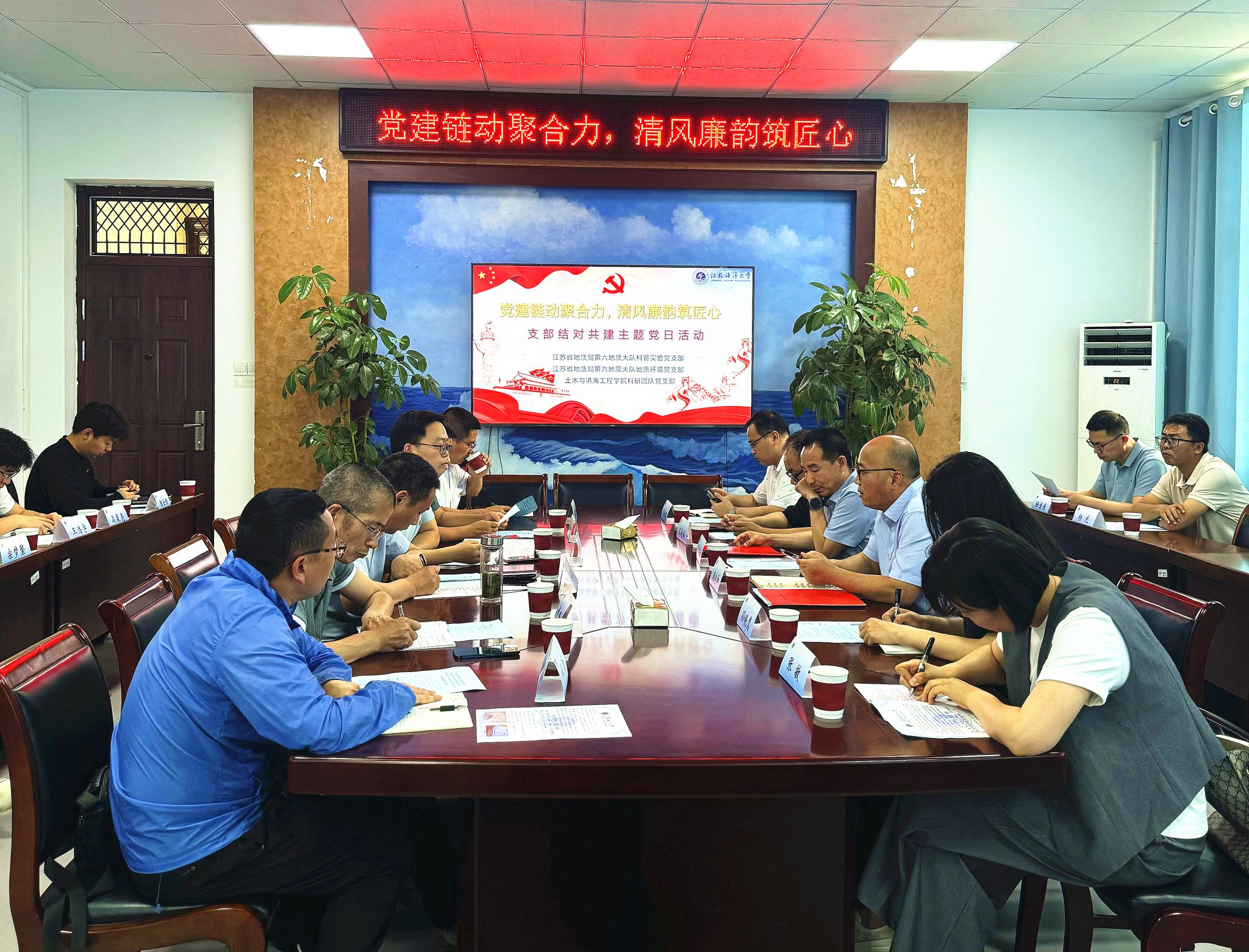 为推动党建与业务融合发展,搭建党建产业链、创新链联通渠道,6月25日下午,江苏省地质局第六地质大队科普实验党支部、地质环境党支部,在土木与港海工程学院土木楼302会议室同学院科研团队党支部联合开展“党建链动聚合力,清风廉韵筑匠心”结对共建主题党日活动。