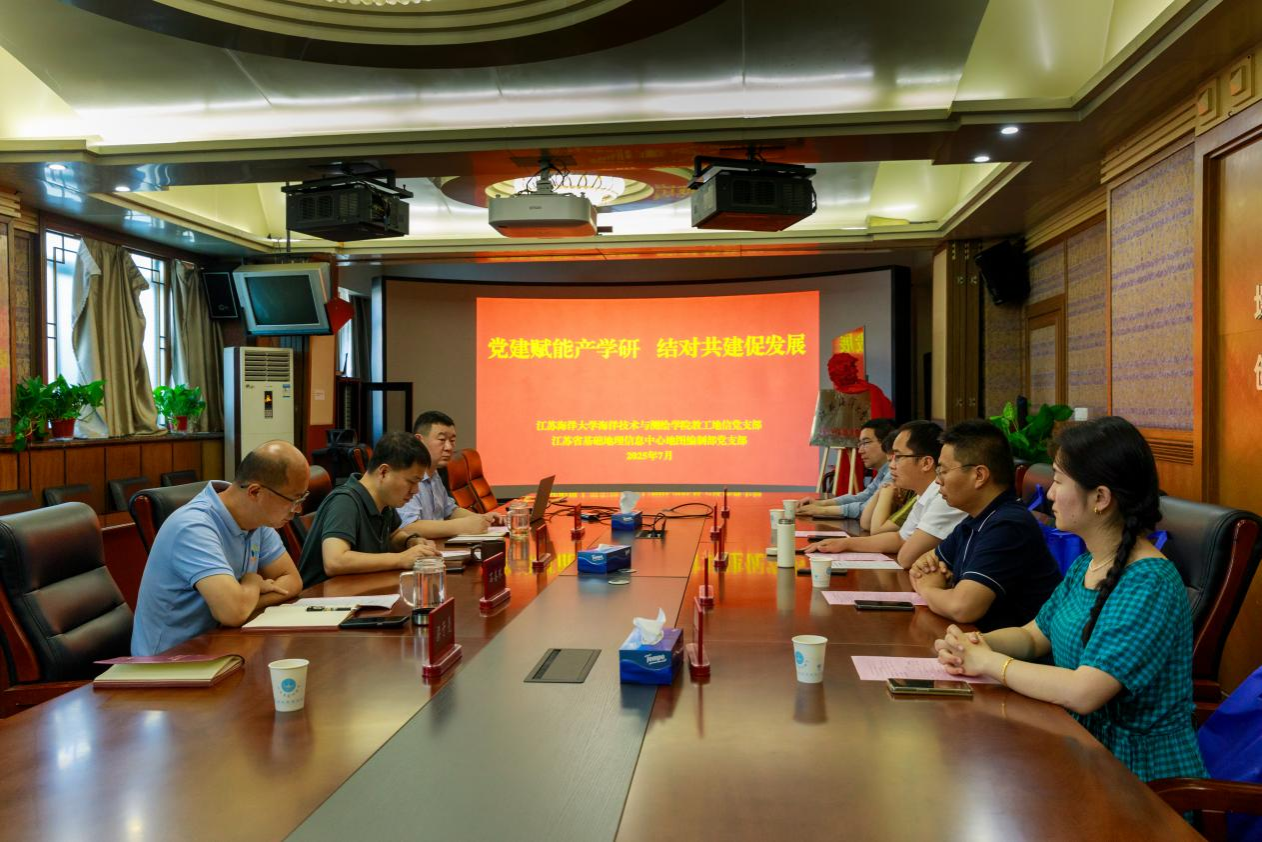 为以党建共建赋能时空信息产学研合作,推动院系学科专业党组织与行业组织在党建和业务工作方面深度合作,7月1日下午,海洋技术与测绘学院地理信息系教工党支部与省基础地理信息中心地图编制部党支部联合举行“党建赋能产学研 结对共建促发展”迎“七一”党建共建活动。江苏省基础地理信息中心党委委员、副主任江峰、省基础地理信息中心地图编制部党支部书记牛海鹏,海洋技术与测绘学院党委副书记(主持工作)司成伟,海洋技术与测绘学院地理信息系教工党支部书记邱志伟、系主任杨毅等共同参加活动。