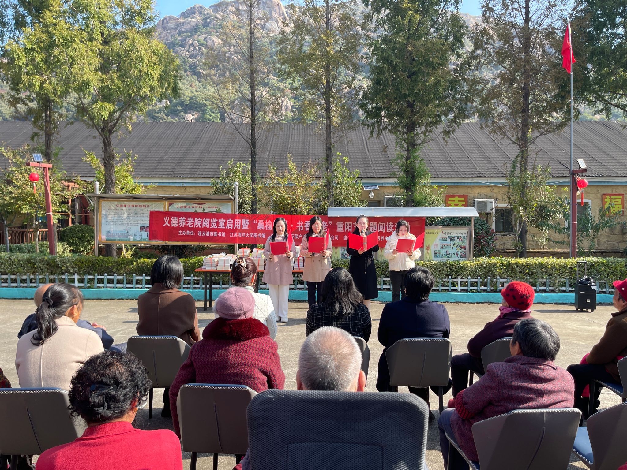 为进一步弘扬尊老敬老的中华传统美德,切实践行新时代党员初心使命,10月27日上午,在义德养老院,我校图书馆联合连云港市图书馆和连云港金海环保产业发展集团有限公司,共同开展“桑榆情暖 书香敬老”重阳节主题阅读活动。图书馆党总支开展同主题党日活动。此次活动通过募资捐书和互动联谊,给老人们送去书香关怀。我校图书馆的12名党员、青年馆员和共建单位志愿者参加活动。