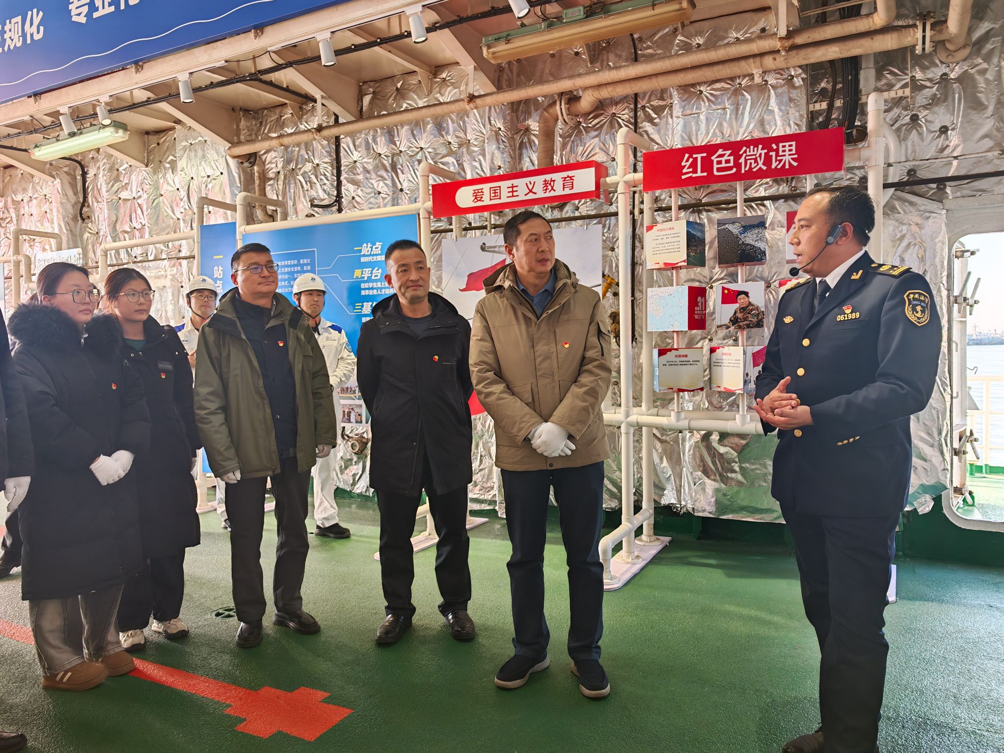 一行人先登上江苏省最大的公务船“海巡31”轮,在直升机甲板上举行了“党建共建基地”揭牌仪式,商学院党委书记万金店和连云港海事局党组成员、纪检组组长、二级巡视员杨洋共同揭牌。孙宝川船长为一行人详细介绍了“海巡31”轮,讲解了“海巡31”轮维护蓝色国土安全的光荣历史。他告诉师生们,“海巡31”轮是我国海事系统第一艘适航无限航区、第一艘拥有直升机起降平台、直升机库和飞行指挥塔等全套船载系统的大型海巡船,列编以来作为“英雄船”“功勋船”在服务海洋强国建设中作出了突出贡献。“海巡31”轮是全国首个省级流动爱国主义教育基地,曾经出访夏威夷、巡航南沙群岛、参与搜救马航MH370失联客机。孙船长还介绍了船舶雷达、电子海图和光电追踪取证系统等设备。党员同志们对该船的辉煌历史和先进设备赞叹不已,他的专业介绍也让师生们对浩瀚的海洋世界有了更深入的认识。